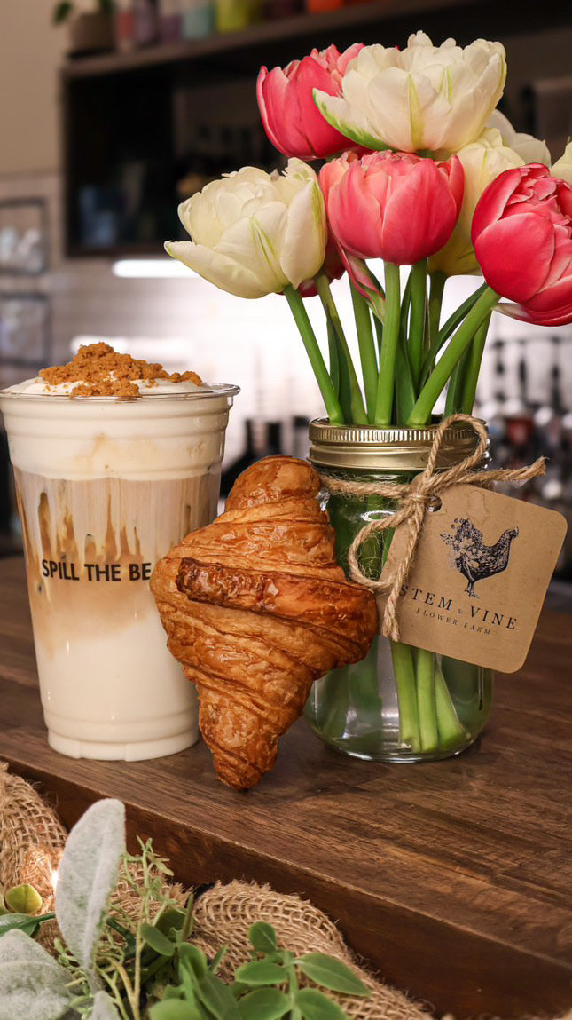 Mom's favorite bundle is back! Bundle includes your drink of choice, a buttery croissant and our fresh farm blooms. $42+tax. Order before 4pm 5/8 for pickup at Bruno's Cafe in Unionville or Southbury on Mother's Day 5/10.