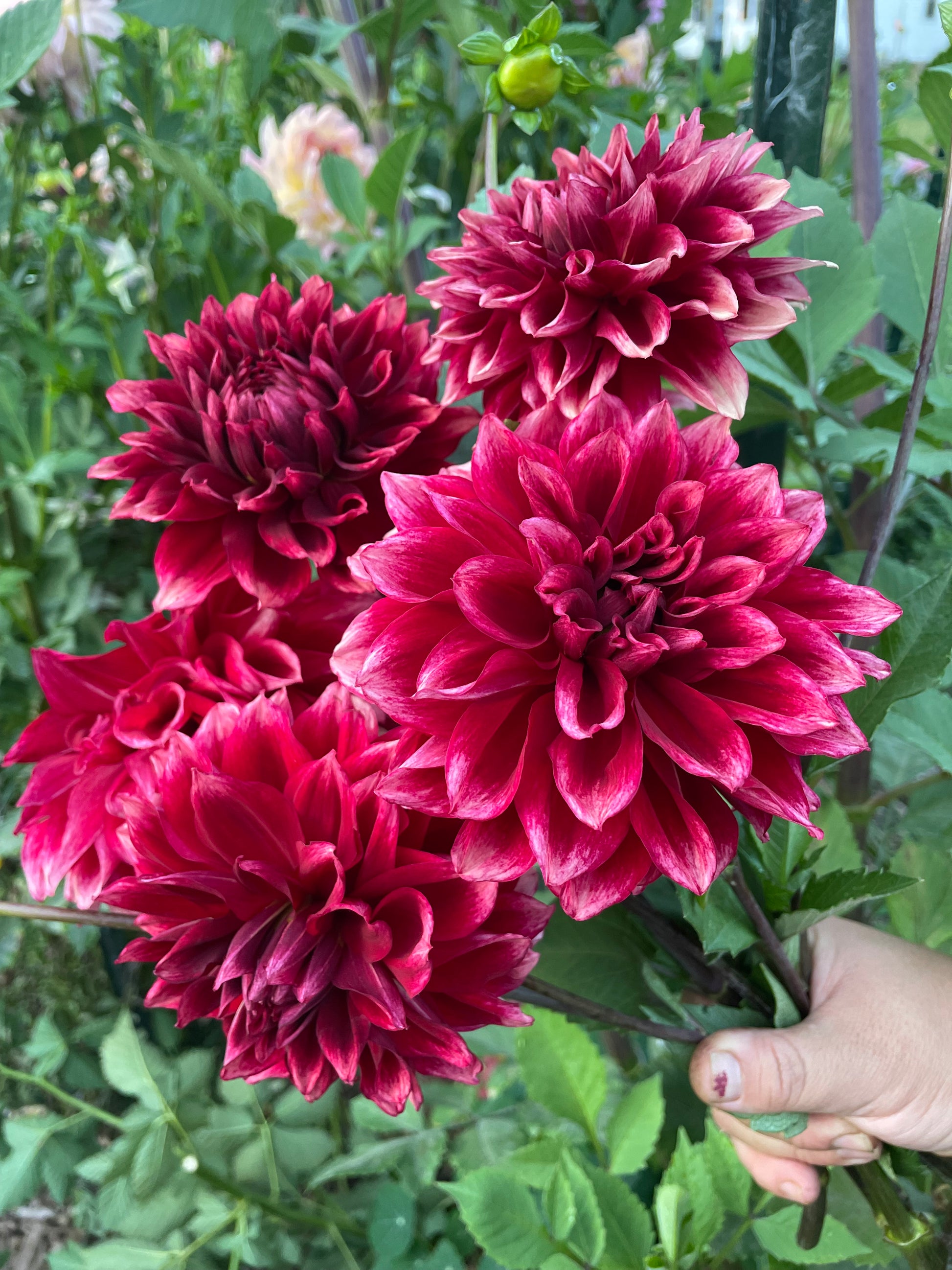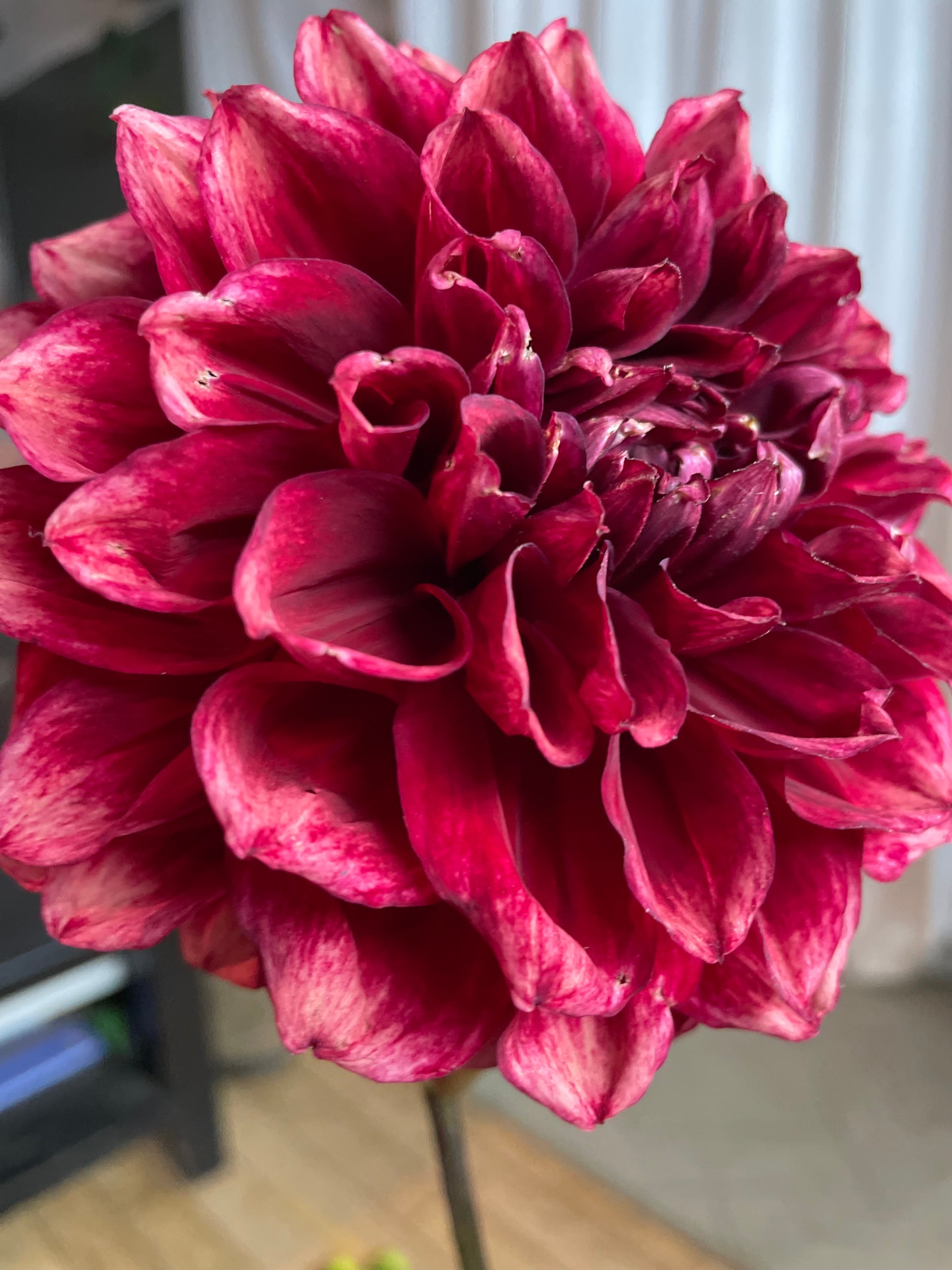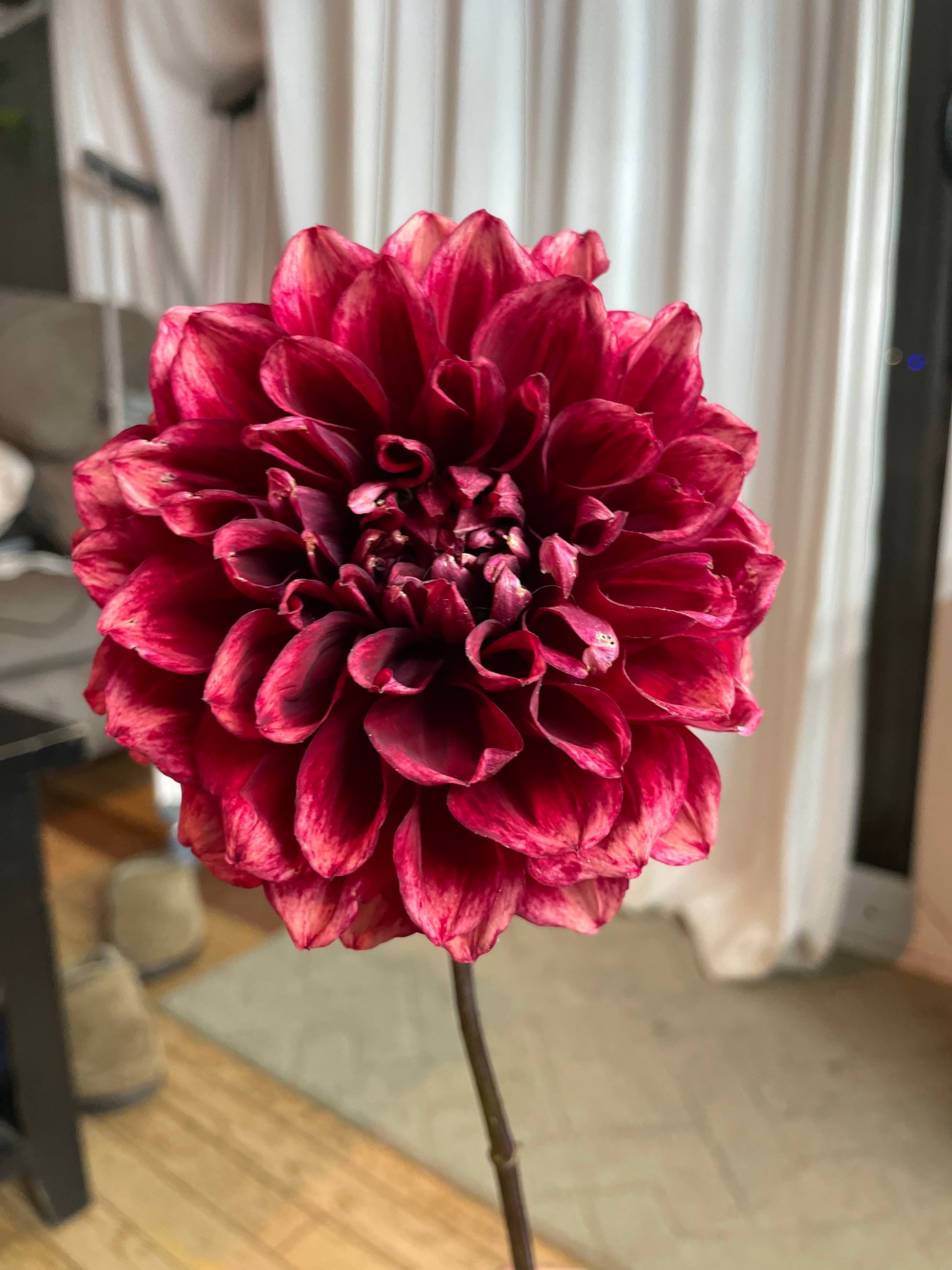 A showstopper! I can’t quite describe the colors - reds, raspberry and burgundy, with painted tips. Perfect for fall - expect to be wowed. Plants are very tall and very large for us, as are the flowers. Give it extra space in the garden and stake well! Lots of blooms.