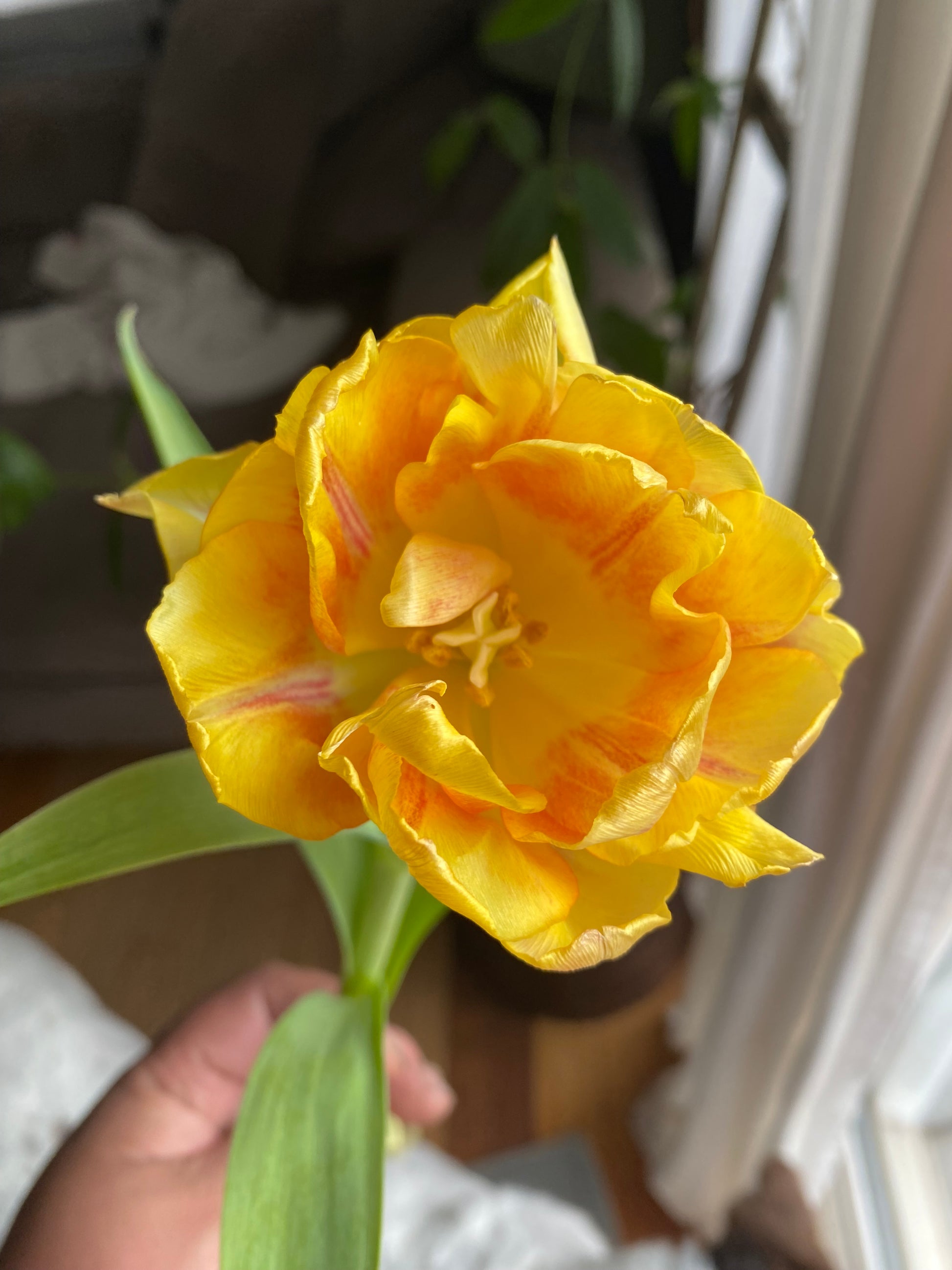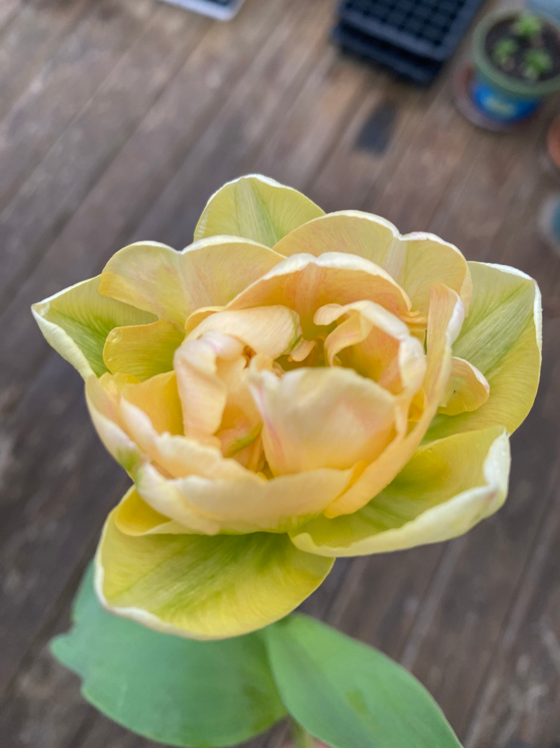 Charming beauty is a special tulip - some blooms are orange/peach, others grapefruit pink, and still others more yellow. It goes with a variety of warm tones and would be show stopping in the garden. Double mid to late bloom time.