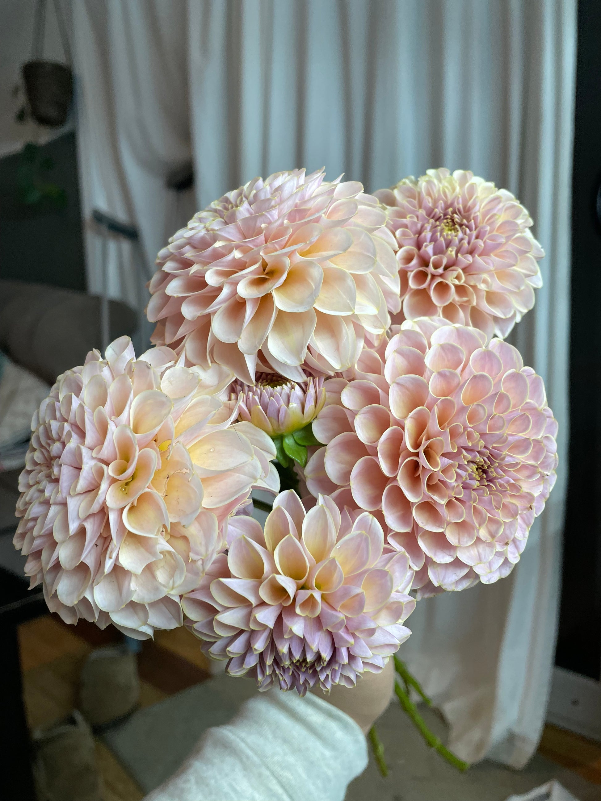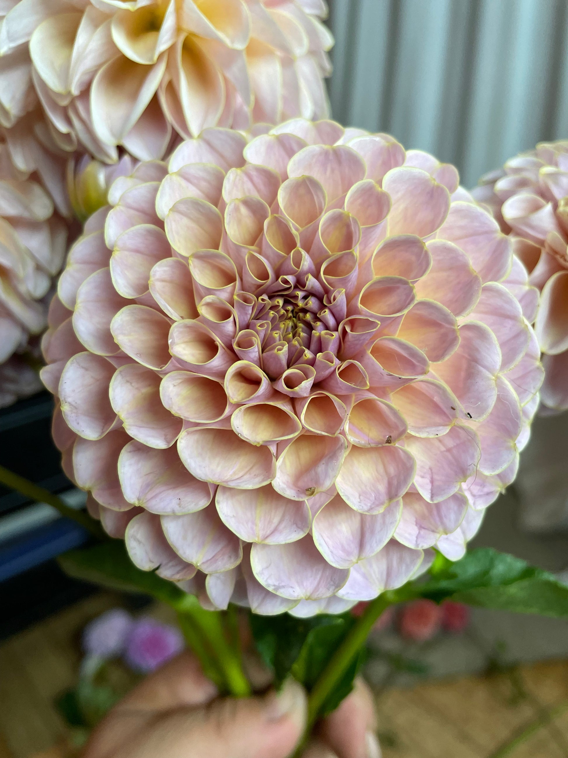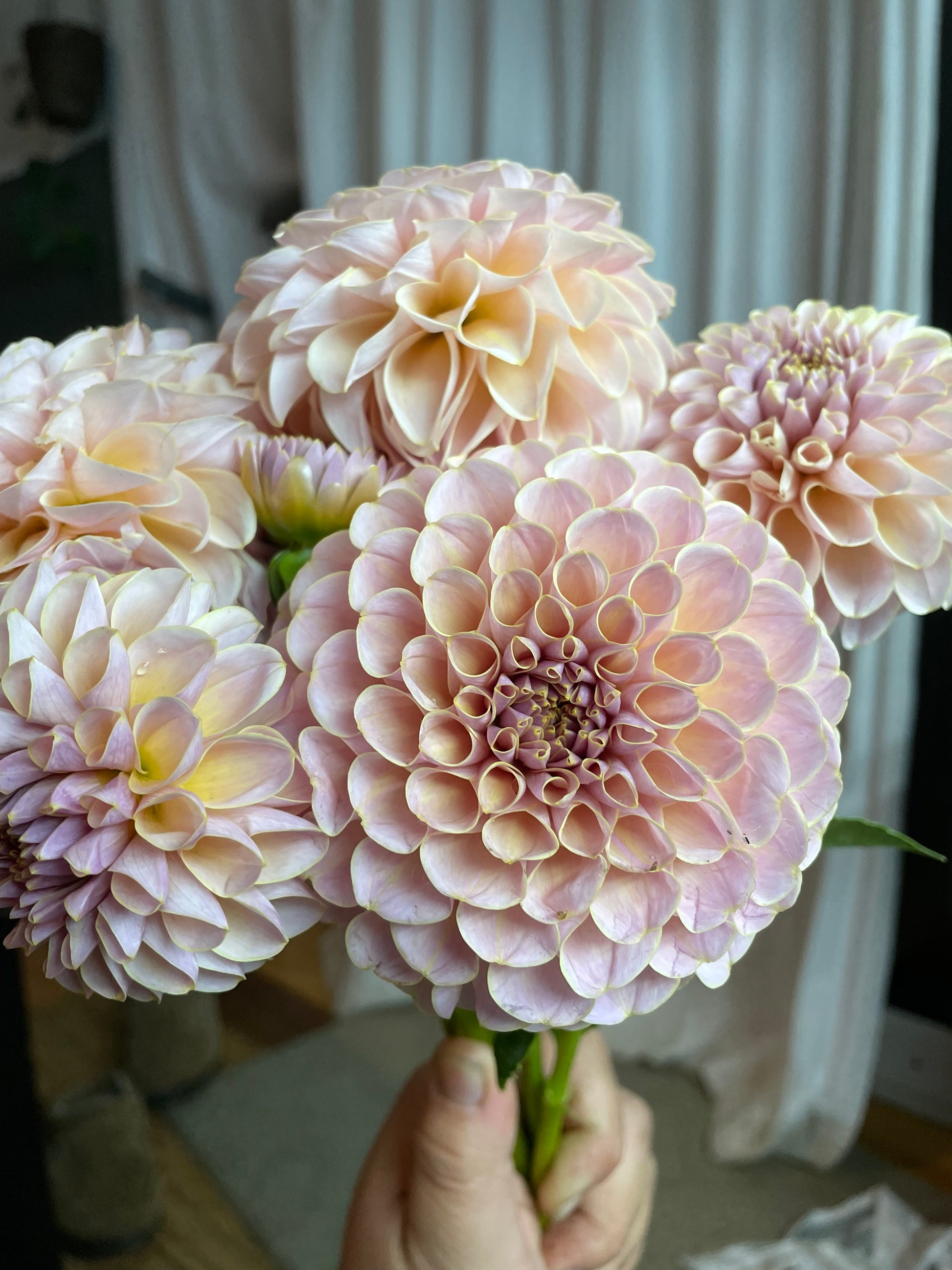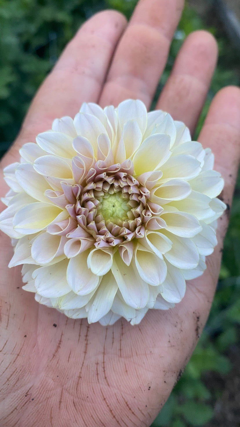 Cinder Rose is one of the most beautiful dahlias we have ever seen or grown. Lavender, ice pink, and cream with a golden picotee. It shines in the garden, and is a blush dahlia lover's dream. Even in bad lighting, the blooms are luminescent. This cultivar is a highly productive bloomer, and an early bloomer for us (we planted from cuttings). It has excellent stems for cutting. I an always impressed with it.