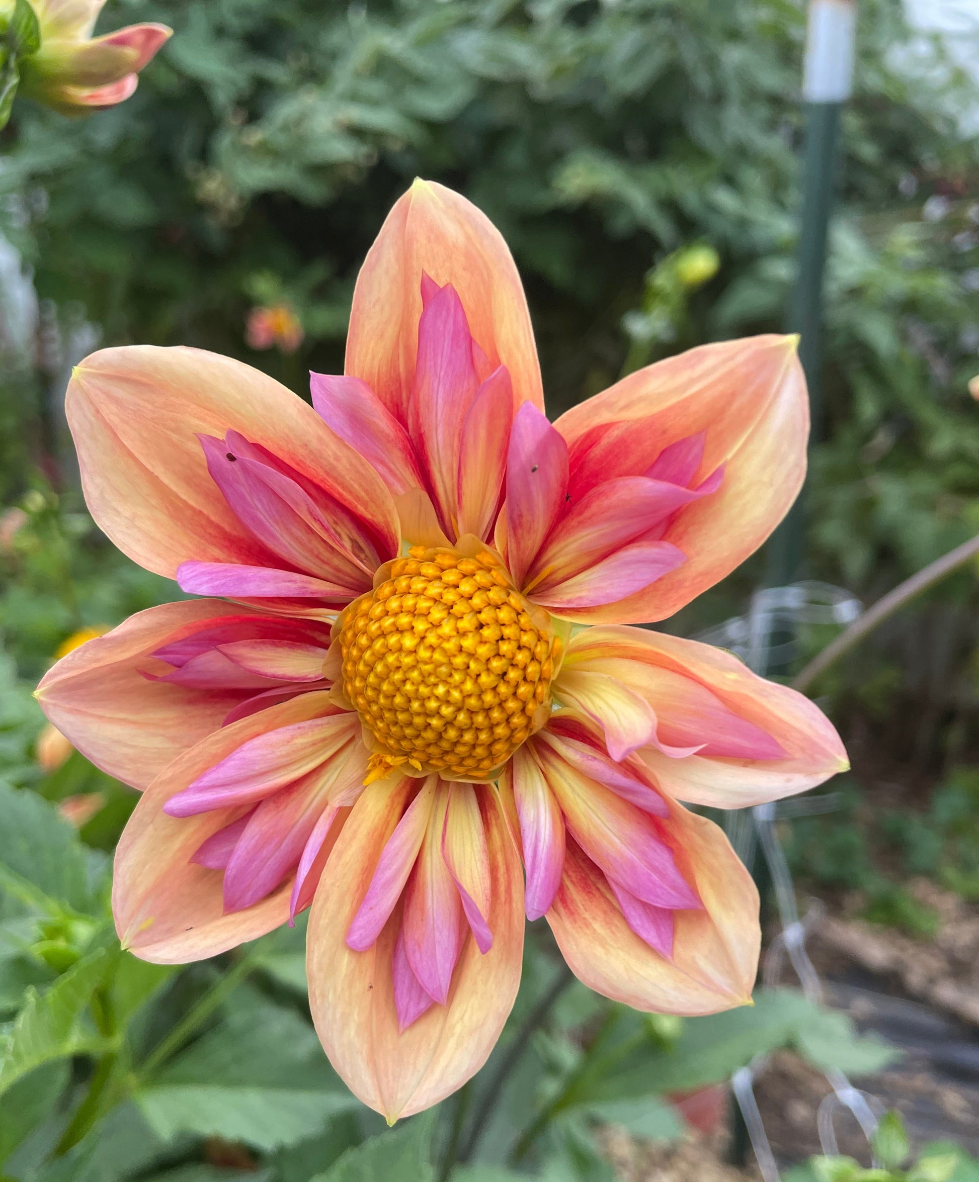A European cultivar. A vibrant collarette with orange, peach, lavender and pink tones. The colors are very unique. Darker foliage and stems. Tubers tend to be are long with thinner necks but they seem to store well. Prolific with the blooms and the tubers too!
